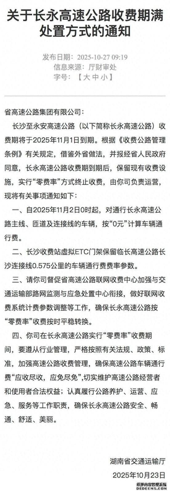 根据相关规定,政府还贷公路有一定的收费期限,一般不得超过30年。早前,湖南省交通运输厅发布《关于长永高速公路收费期满处置方式的通知》,明确长永高速公路收费期满处置方式。长永高速公路收费期将于2025年11月1日到期,收费期到期后,保留现有收费设施,实行“零费率”方式终止收费,由湖南省高速公路集团有限公司负责运营。